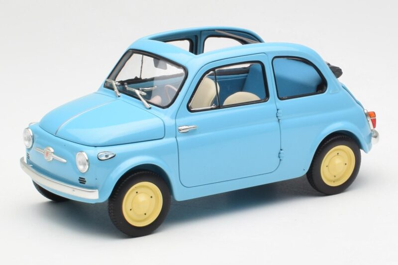 The Fiat Nuova 500 Celeste Modrý Kyosho 1:18 is crafted from Kov. Die-cast zinc alloy body with detailed plastic parts, rubber tires, and high-quality paint finish. Die-cast models are known for their weight, durability, and realistic feel.