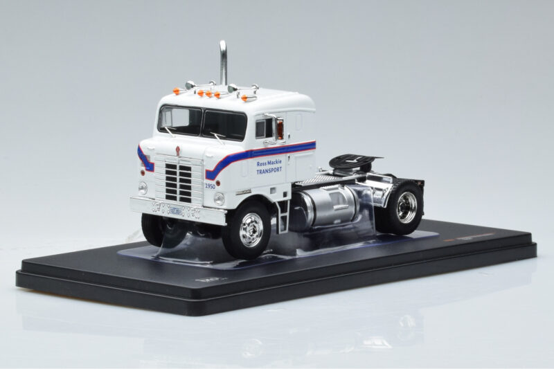 The Kenworth Bullnose Ross Mackie Transport Biely IXO 1:43 is crafted from Kov. Die-cast zinc alloy body with detailed plastic parts, rubber tires, and high-quality paint finish. Die-cast models are known for their weight, durability, and realistic feel.