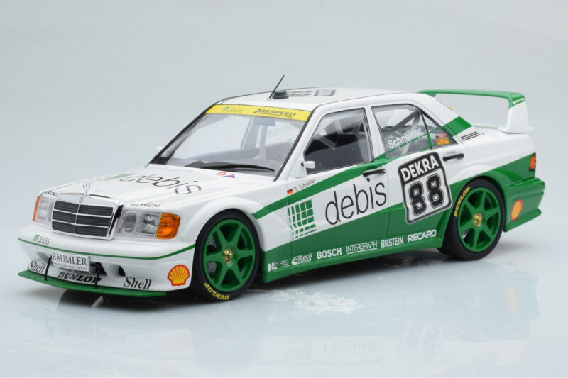 The Mercedes 190E 2.5-16 W201 EVO 2 Debis #88 B. Schneider Team Zackspeed DTM 1991 Minichamps 1:18 is crafted from Kov. Die-cast zinc alloy body with detailed plastic parts, rubber tires, and high-quality paint finish. Die-cast models are known for their weight, durability, and realistic feel.