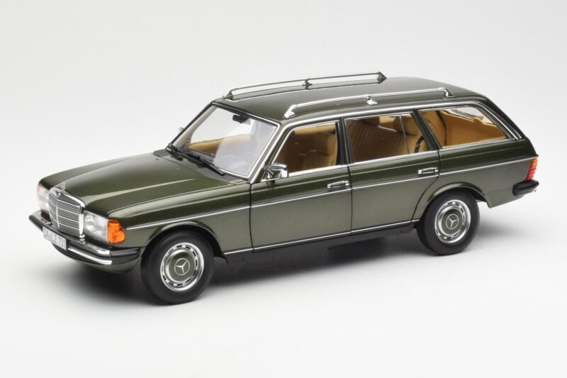 The Mercedes 230T W123 T-Model Zelený Metalíza Norev 1:18 is crafted from Kov. Die-cast zinc alloy body with detailed plastic parts, rubber tires, and high-quality paint finish. Die-cast models are known for their weight, durability, and realistic feel.