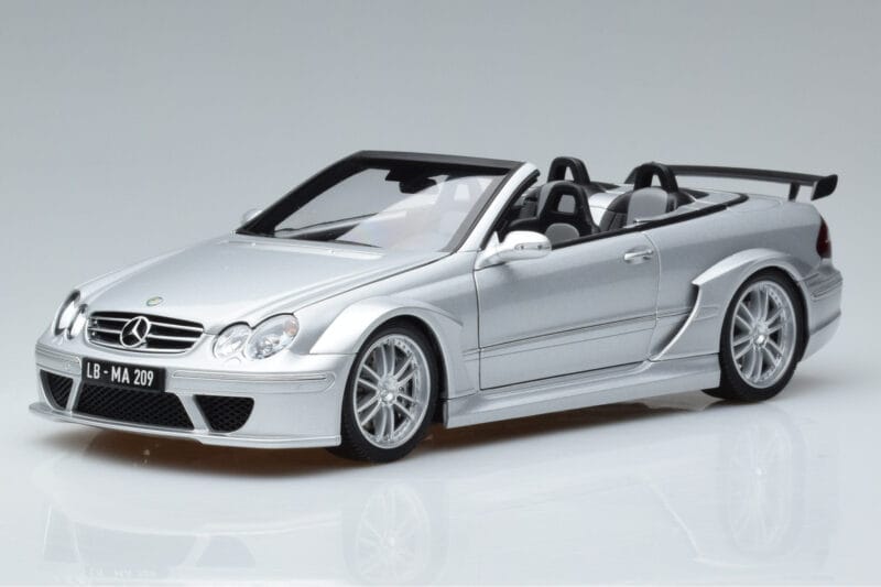 The Mercedes CLK DTM AMG W209 Kabriolet Strieborný Kyosho 1:18 is crafted from Kov. Die-cast zinc alloy body with detailed plastic parts, rubber tires, and high-quality paint finish. Die-cast models are known for their weight, durability, and realistic feel.
