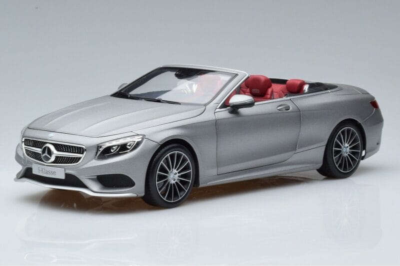 The Mercedes S-Class A217 Kabriolet Šedý Norev 1:18 is crafted from Kov. Die-cast zinc alloy body with detailed plastic parts, rubber tires, and high-quality paint finish. Die-cast models are known for their weight, durability, and realistic feel.