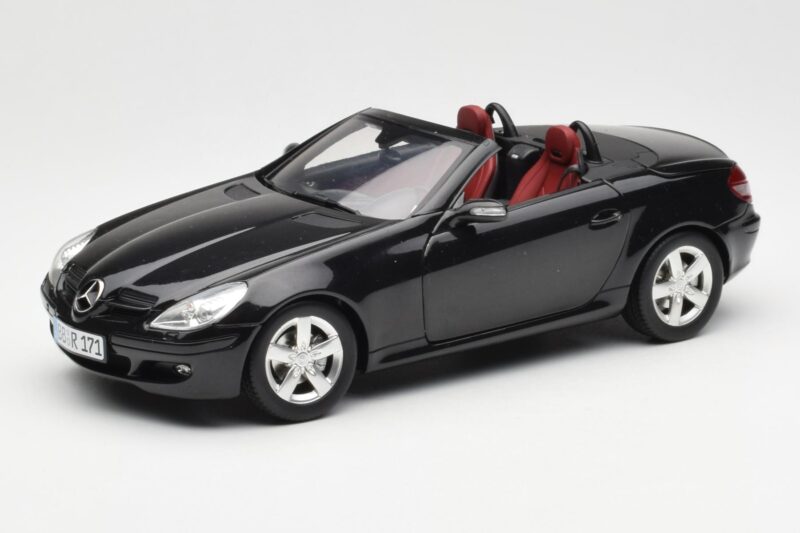 The Mercedes SLK R171 Obsidian Čierny Metallic Minichamps 1:18 is crafted from Kov. Die-cast zinc alloy body with detailed plastic parts, rubber tires, and high-quality paint finish. Die-cast models are known for their weight, durability, and realistic feel.