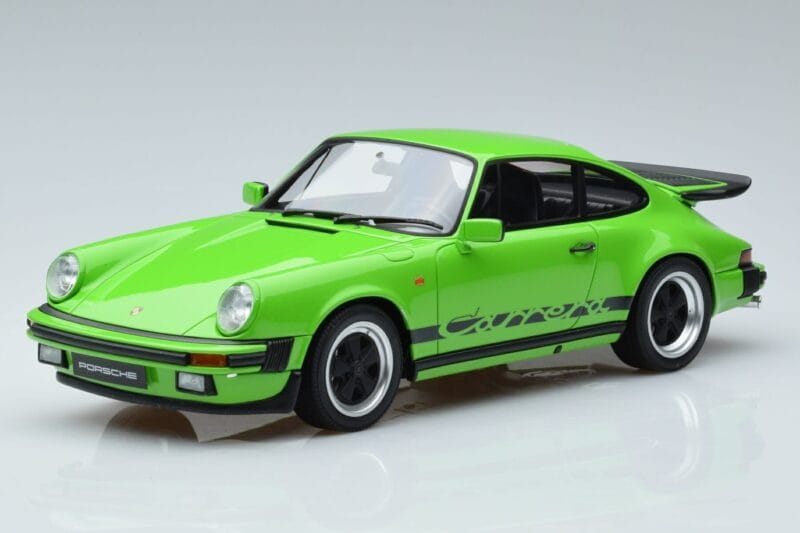 A 1:18 scale model measures approximately 25-28 cm (approximately 10-11 inches). The Porsche 911 3.2 Carrera Limetková Zelená GT Spirit 1:18 is perfect for display in a glass cabinet or on a shelf.