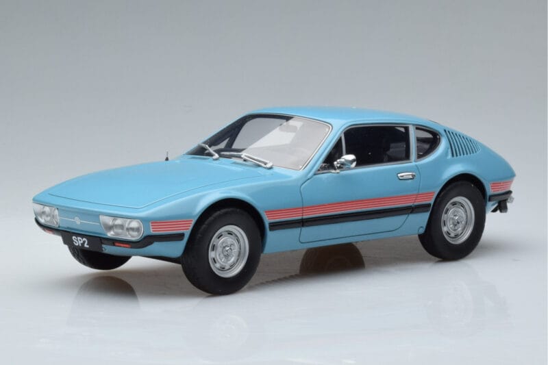 A 1:18 scale model measures approximately 25-28 cm (approximately 10-11 inches). The Volkswagen SP2 Modrý Otto 1:18 is perfect for display in a glass cabinet or on a shelf.